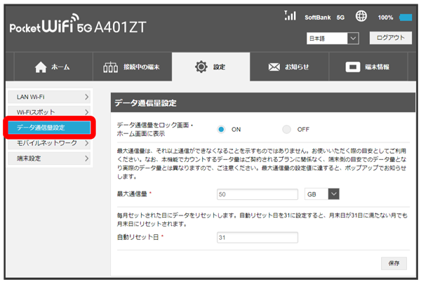- 最大通信量で設定したデータ通信量を超えると、本機の