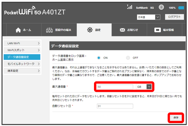 - お買い上げ時の最大通信量は50GBに設定されています。