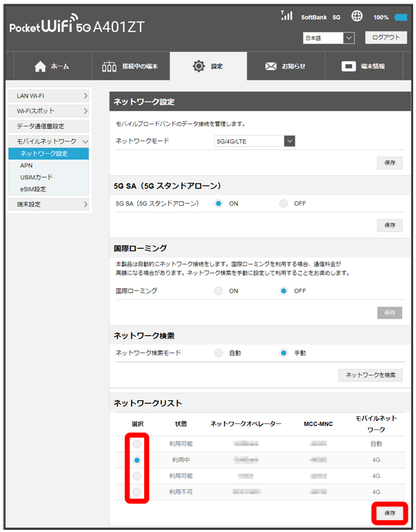 設定できるモバイルネットワークのリストが作成されます。