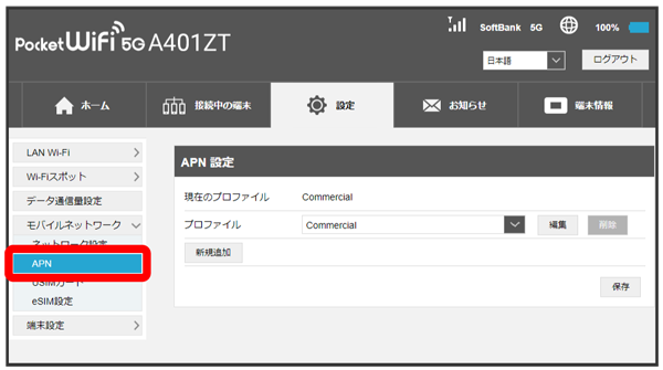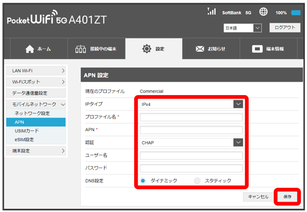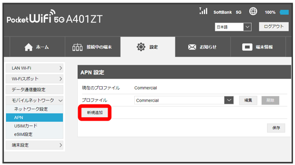 接続先のAPNを追加・変更するには、次の項目を設定して新しいプロファイルを作成します。