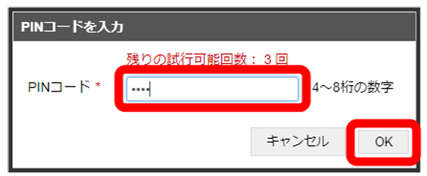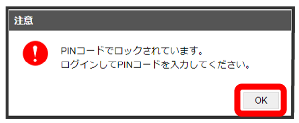 本機の電源を入れてパソコン接続したときに、パソコンからWEB UIへアクセスしようとすると、「PINコードでロックされています。PINコードを入力してください。」という注意画面が表示されます。