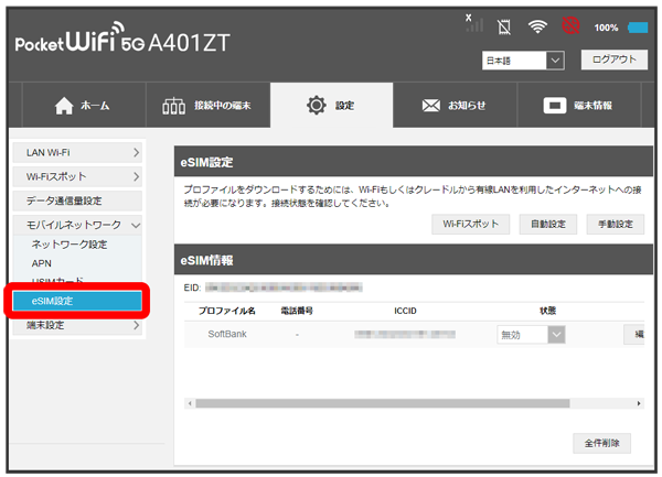 - をクリックするとすべてのeSIMが削除されますのでご注意ください。