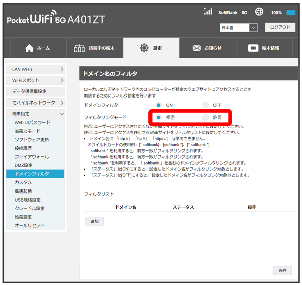- フィルタリングモードでを選択した場合は、アクセスさせたくないウェブサイトをフィルタリストに設定します。を選択した場合は、アクセスを許可するウェブサイトをフィルタリストに設定します。