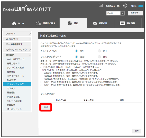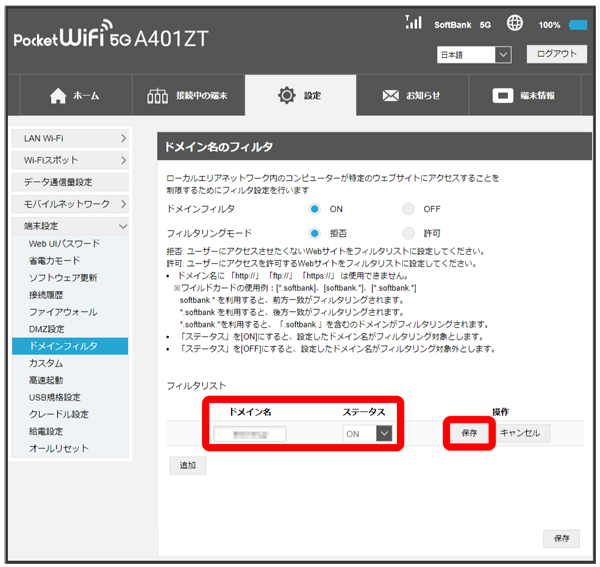 - ステータスをに設定すると、設定したドメイン名はフィルタリングの対象になります。ステータスをに設定するとフィルタリングの対象外になります。