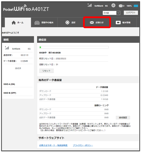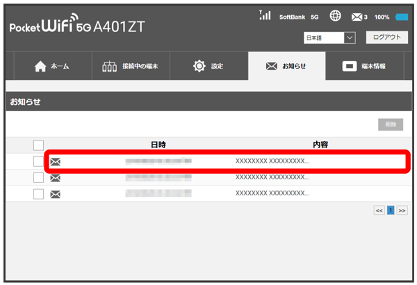 - 新着のお知らせの受信通知メッセージがポップアップ画面で表示された場合は、をクリックします。
