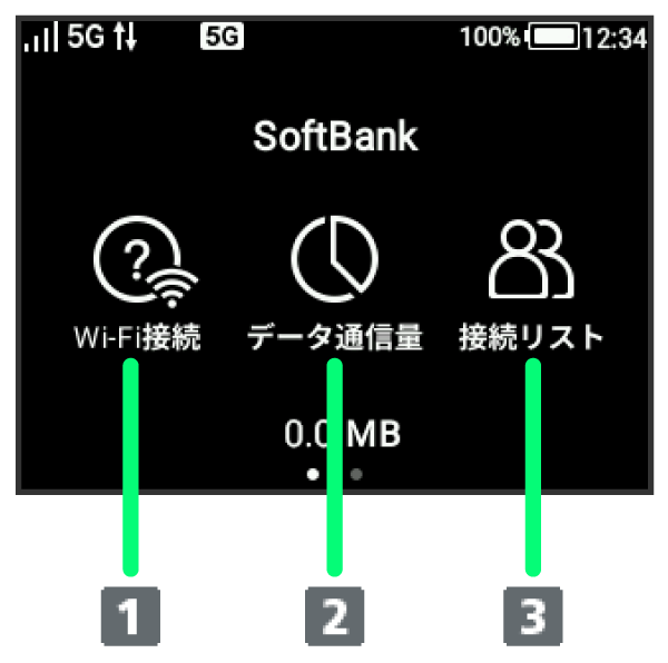 | Wi-Fi接続 | QRコードやWPSでの接続、本機のSSIDとパスワード(セキュリティキー)の確認や設定ができます。 |