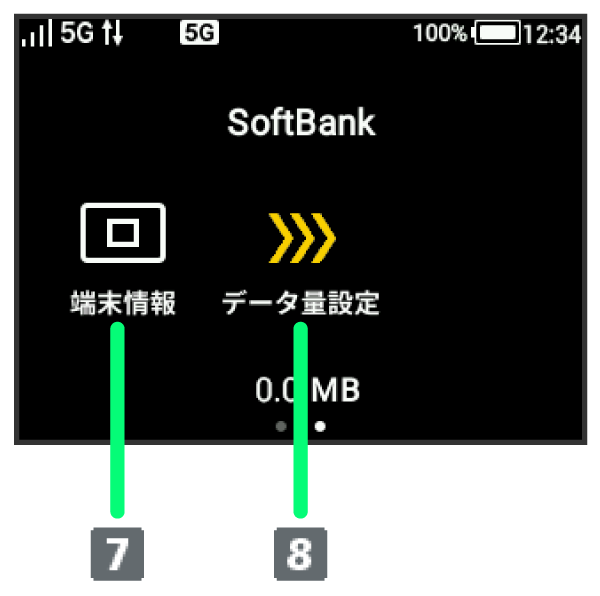 | データ量設定(個人で契約された場合) | データ通信量が、通信速度の低速化が開始される値に近づいた場合、または通信速度の低速化が開始された場合にアイコンが表示されます。通常速度に戻すお申し込みや通常速度を維持する予約または予約の取り消しができます。 |