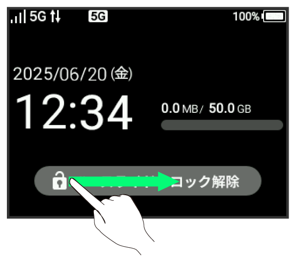 電源が入るとロック画面が表示され、無線LAN機能がONになり、自動的にインターネットに接続します。