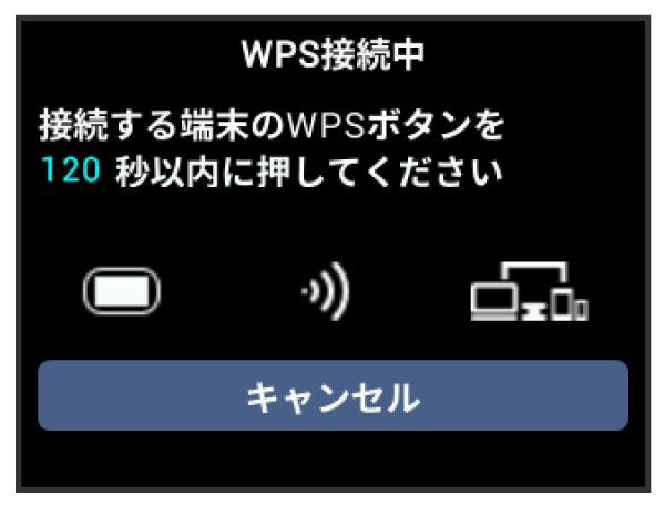 次の画面が表示されている間(120秒以内)に、無線LAN端末でWPS機能の接続設定を行う