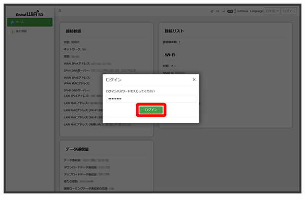 - お買い上げ時のWeb UIのログインパスワードは、IMEI情報(端末識別番号)の下6桁の数字に設定されています。本機のIMEI情報は付属の「無線LAN初期設定シール」や本機メニューのをご確認ください。