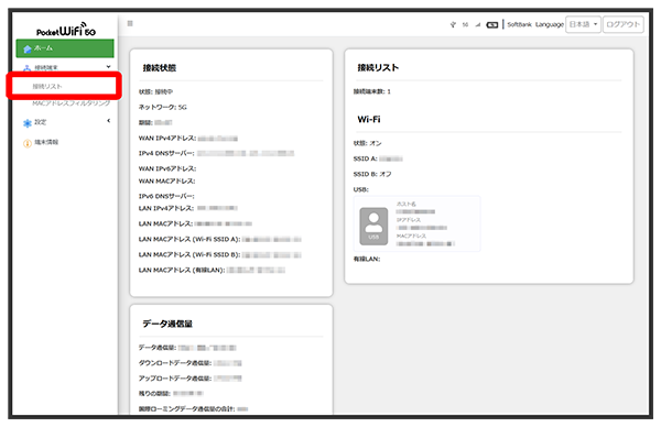 本機に接続している無線LAN端末の一覧が表示されます。マルチSSID機能(SSID B)をONにしている場合は、SSID Bに接続している端末も確認できます。