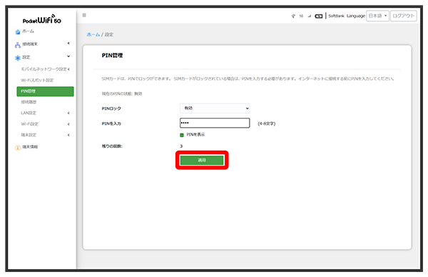 - PIN認証を無効にする場合は、PIN管理画面でPINコードを入力と操作してください。