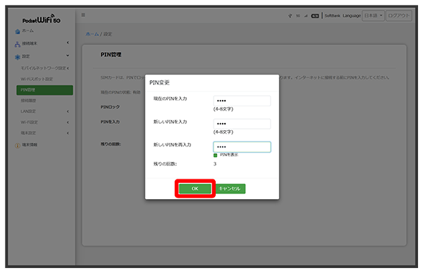 PINコードは、必要に応じて4~8桁のお好きな番号に変更できます。PINコードの変更は、PIN認証が有効に設定されているときにできます。