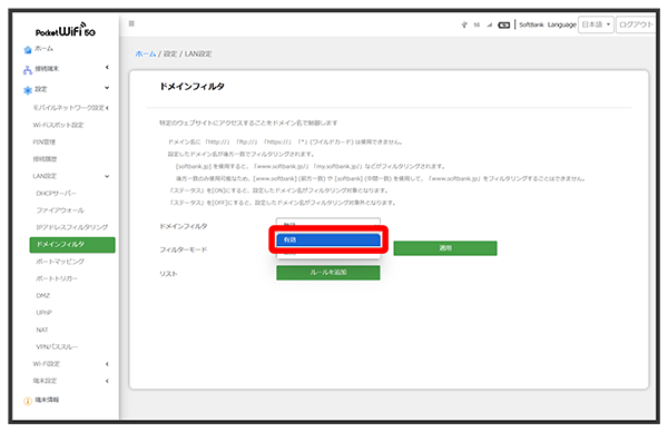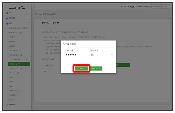 後方一致のみ使用可能なため、www.softbank(前方一致)やsoftbank(中間一致)を使用して、「www.softbank.jp」をフィルタリングすることはできません。 - ドメイン名やステータスを編集するには、ドメイン名のをクリックします。ステータスをに設定すると、設定したドメイン名はフィルタリングの対象になります。ステータスをに設定するとフィルタリングの対象外になります。