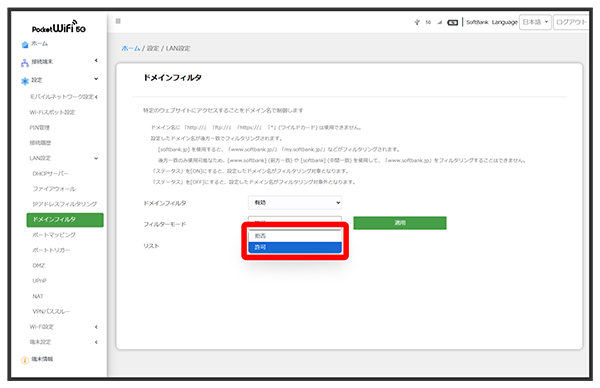 - フィルターモードでを選択した場合は、アクセスさせたくないウェブサイトをフィルタリストに設定します。を選択した場合は、アクセスを許可するウェブサイトをフィルタリストに設定します。