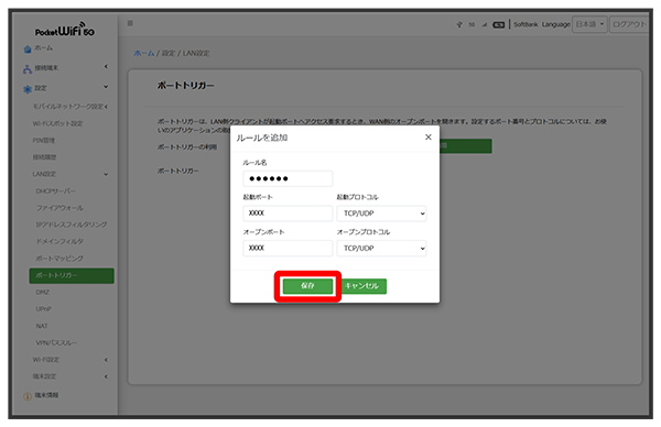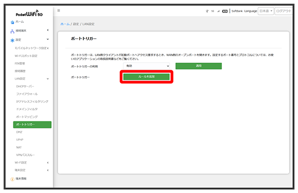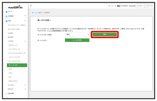 本設定により、LAN内の端末が起動ポートにアクセスしたときに、設定したWAN側のポートを一時的に開放することが可能となります。開放したポートは、10分間通信がない場合、閉じられます。