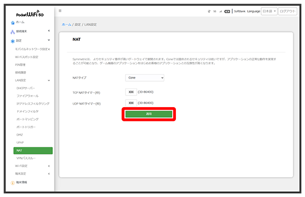 - NATタイマーの設定は、Wi-Fi接続および有線LAN接続、USB接続のすべてに反映されます。