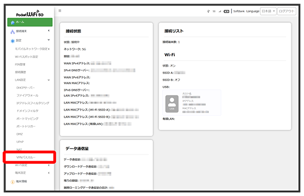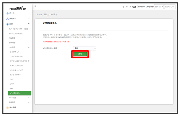 仮想プライベートネットワーク(VPN:Virtual Private Network)機能の設定を行います。パススルー機能によりVPN通信(PPTP/L2TP/IPSec)を通過させることができます。