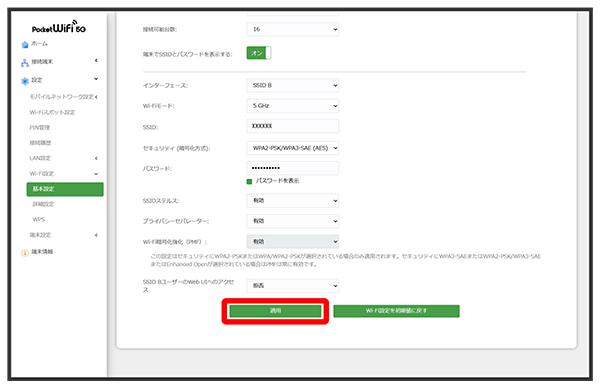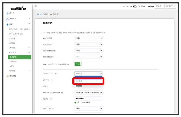 SSID Bについて無線LANの基本的な設定を行います。