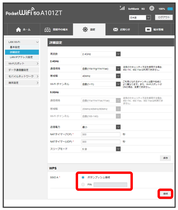 WPS機能対応の無線LAN端末と接続します。Wi-Fi名(SSID)のSSID AとSSID Bそれぞれに接続することができます。