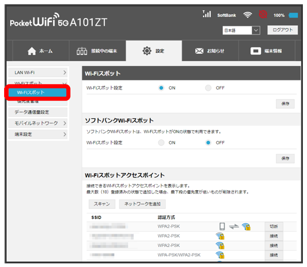 「Wi-Fiスポット設定」のを確認