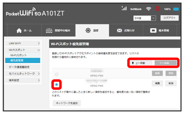 接続先に優先順位を設定し、優先的に接続するアクセスポイントを指定できます。