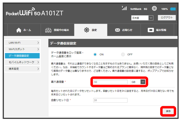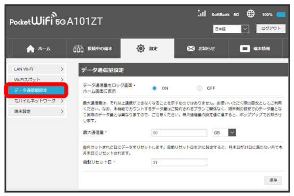 - 最大通信量で設定したデータ通信量を超えると、本機の