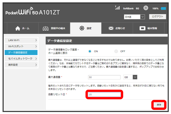 毎月、データ通信量を自動的にリセットする日を設定できます。