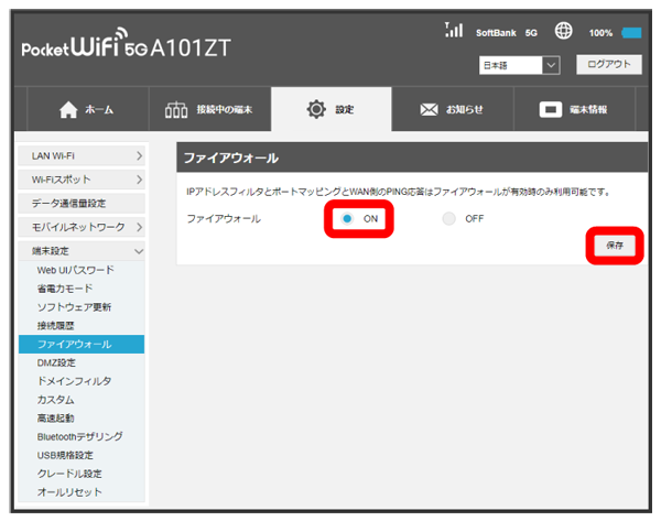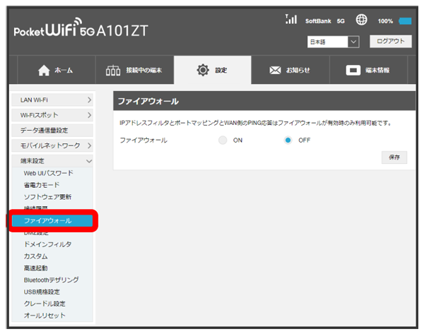 - ファイアウォールをOFFにした場合、IPアドレスフィルタリングやポートマッピング、WAN側のPING応答をONに設定していても無効になります。