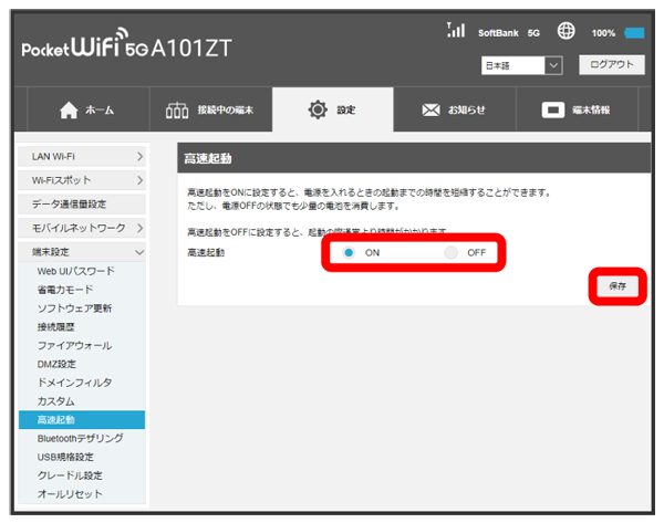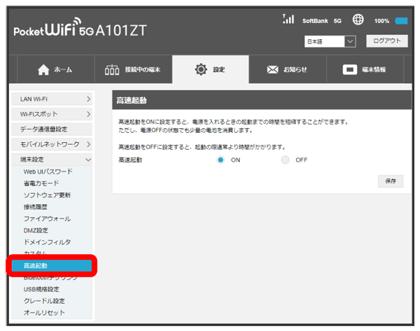 高速起動をONにすることで、電源ON時の時間を短縮することができます。