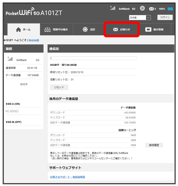 - 新着のお知らせの受信通知メッセージがポップアップ画面で表示された場合は、をクリックします。