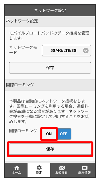 本機の再起動後に、国際ローミングの設定が変更されます。