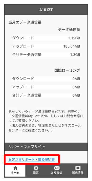 お客さまサポート、取扱説明書のサポートウェブサイトを表示します。