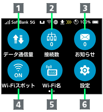 | Wi-Fi名 | 本機のWi-Fi名(SSID)とパスワード(セキュリティキー)の確認や設定ができます。 |