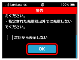 (モバイルネットワーク接続完了アイコン)になったら使用可能です(高速起動設定がONの場合、電源を入れてから約20秒お待ちください)。 - 起動時に警告画面を表示しないようにするには、にチェックを付けます。