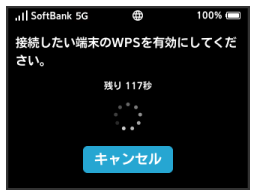 次の画面が表示されている間(120秒以内)に、無線LAN端末でWPS機能の接続設定を行う