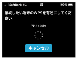 次の画面が表示されている間(120秒以内)に、アクセスポイント端末でWPS機能の接続設定を行う