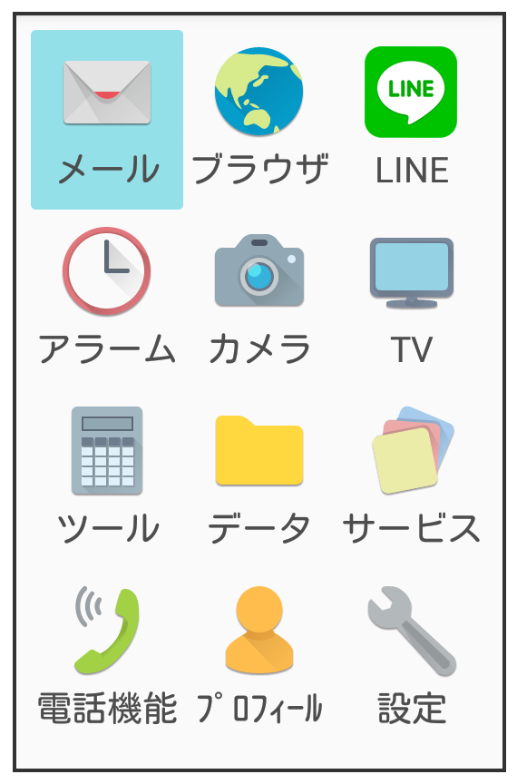 | データ | 本体メモリ/SDカードに保存されている静止画、動画、音楽やその他のファイルをデータフォルダで確認することができます。 データフォルダについて詳しくは、「データを利用する(データフォルダ)」を参照してください。 |