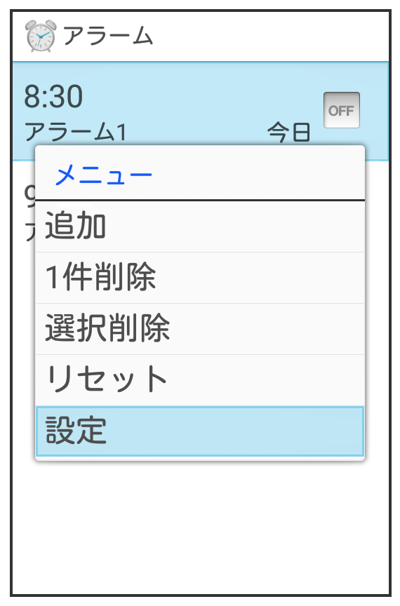 アラーム鳴動時の動作、休日に関する設定などができます。設定できる項目は次のとおりです。