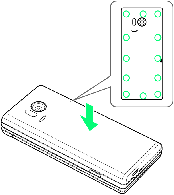 - 電池カバーを本体に合わせて置き、〇の位置をしっかりと押して、本体との間にすき間がないことを確認してください。