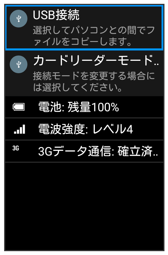 - USB接続が表示されていない場合は、通知パネルの/と操作します。
