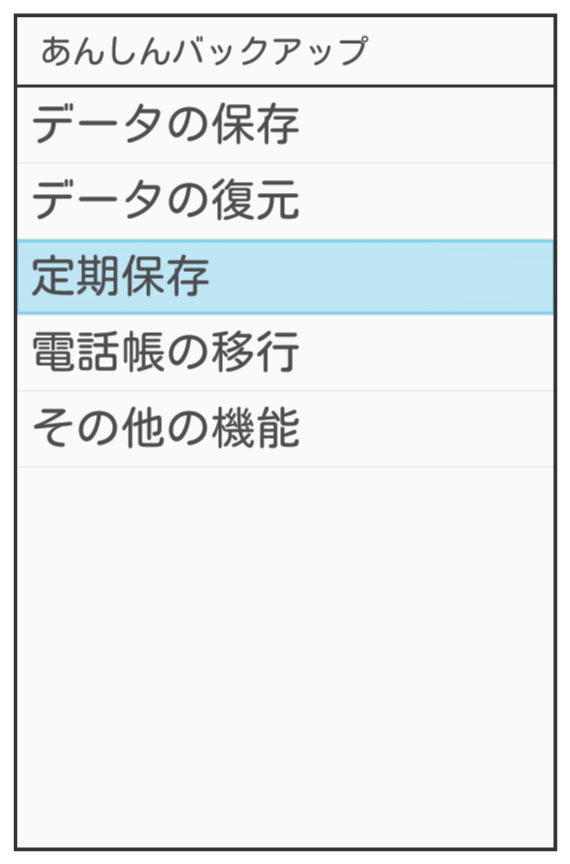 - 本体に登録されている電話帳データ/ブックマークデータ/カレンダーデータ/発着信履歴データ/画像データ/音楽データ/動画データの全件をサーバー/SDカードなどに保存します。1件ずつ、または一部のデータを選択して保存することはできません。