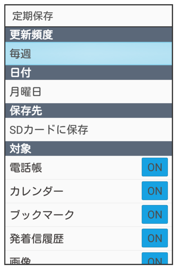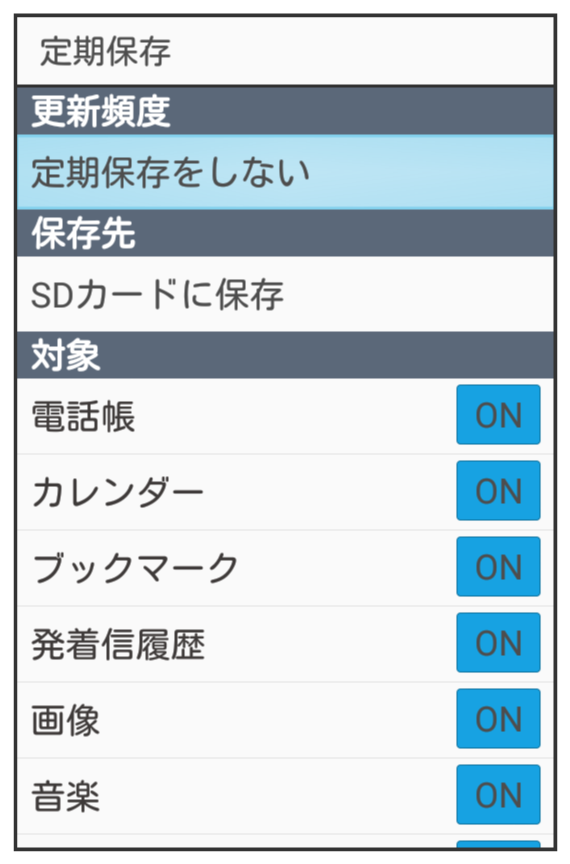 本体の電話帳データ/ブックマークデータ/カレンダーデータ/発着信履歴データ/画像データ/音楽データ/動画データを、サーバー/SDカードなどに定期的に自動で保存します。