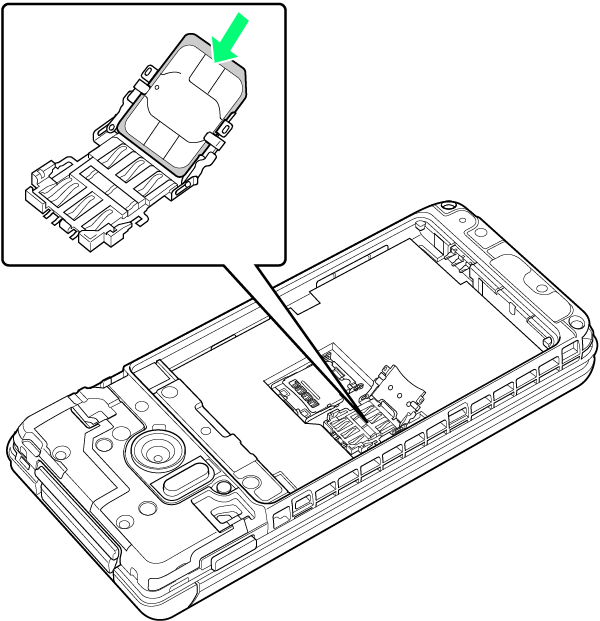 - USIMカードの向き(切り欠き部分/IC(金属)部分を上)に注意して、USIMカードを矢印の方向にスライドさせ、USIMカードスロットカバーに取り付けます。