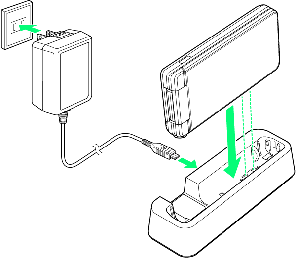 卓上ホルダー[SHEGC1]と、別売のACアダプタ(microUSB Quick ChargeTM 2.0対応)[ZSDBA4]1、またはACアダプタ(microUSB 1.0A)[ZSDBA6]2を使用して充電します。