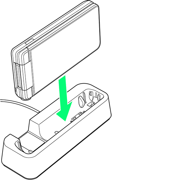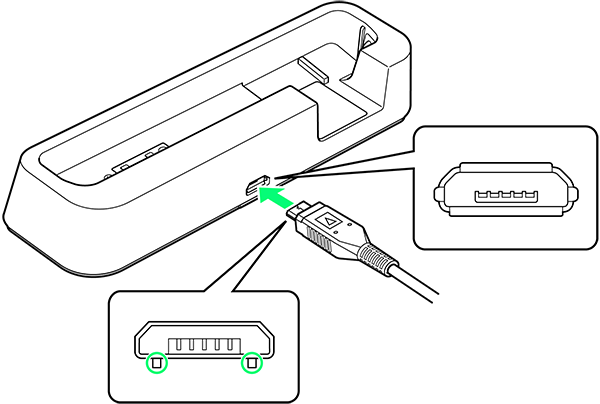 - microUSBプラグを誤った向きに差し込むと、卓上ホルダーの接続端子が破損することがあります。microUSBプラグの形状と向きをよく確かめて、突起(○部分)を下にして差し込んでください。