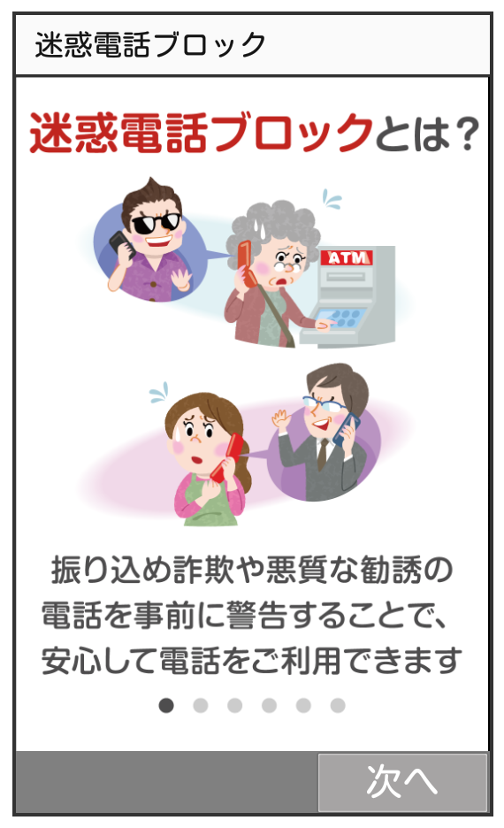 迷惑電話ブロックサービスを利用すると、振り込め詐欺や悪質な勧誘などの迷惑電話の着信に対して、自動で警告を表示させたり、着信を拒否することができます。また、迷惑電話への発信に対しても警告を表示したり、発信の中断ができます。公共施設や企業からの着信のときは、ハローページの情報をもとに名称を表示するので、安心して電話に出られます。ご利用には「ケータイ基本パック for 4G ケータイ」または「迷惑電話ブロック」へのお申し込みが必要です。