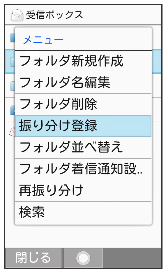 相手のメールアドレスや、件名などによって、自動的にメールをフォルダに振り分けることができます。ここでは電話帳に登録している差出人を指定してメールを振り分ける方法を例に説明します。