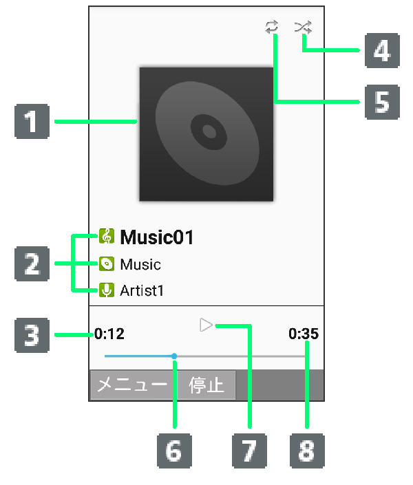 音楽再生画面で- このあと再生を中止するときは、待受画面で次の操作を行います。