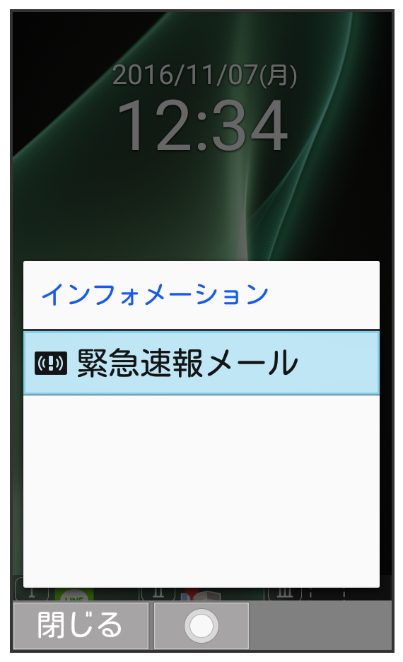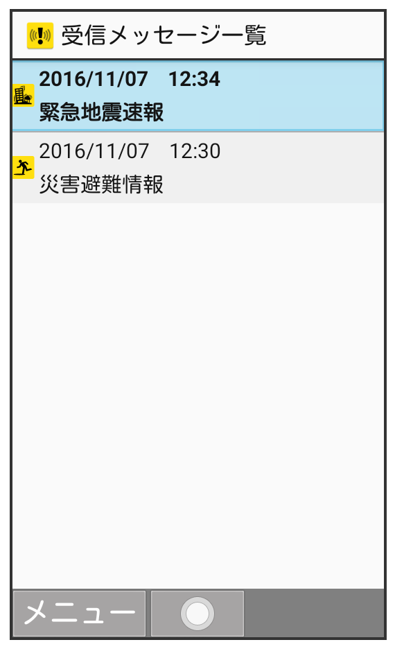緊急速報メールの受信画面が表示され、緊急地震速報用警告音/災害・避難情報、津波警報用警告音およびバイブレータでお知らせします。
